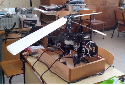 two quadcopters and an acrobatic helicopter in the laboratory.